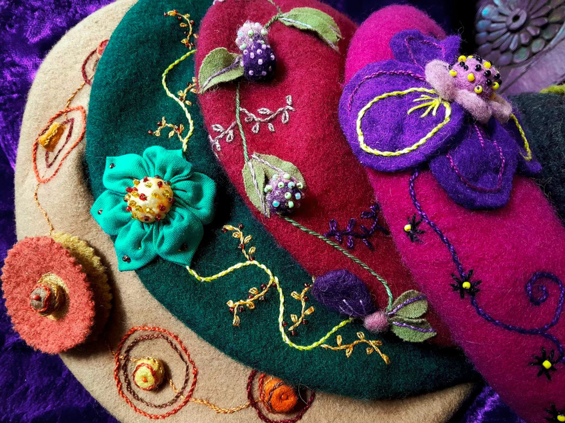 Je brode des chapeaux en laine feutrée, chapeaux cloche, bérets, bobs, casquettes, toques... Avec des motifs variés aux coloris métissés dans une recherche d’alliances parfois improbables, surprenantes avec toujours le souci d’harmonie.